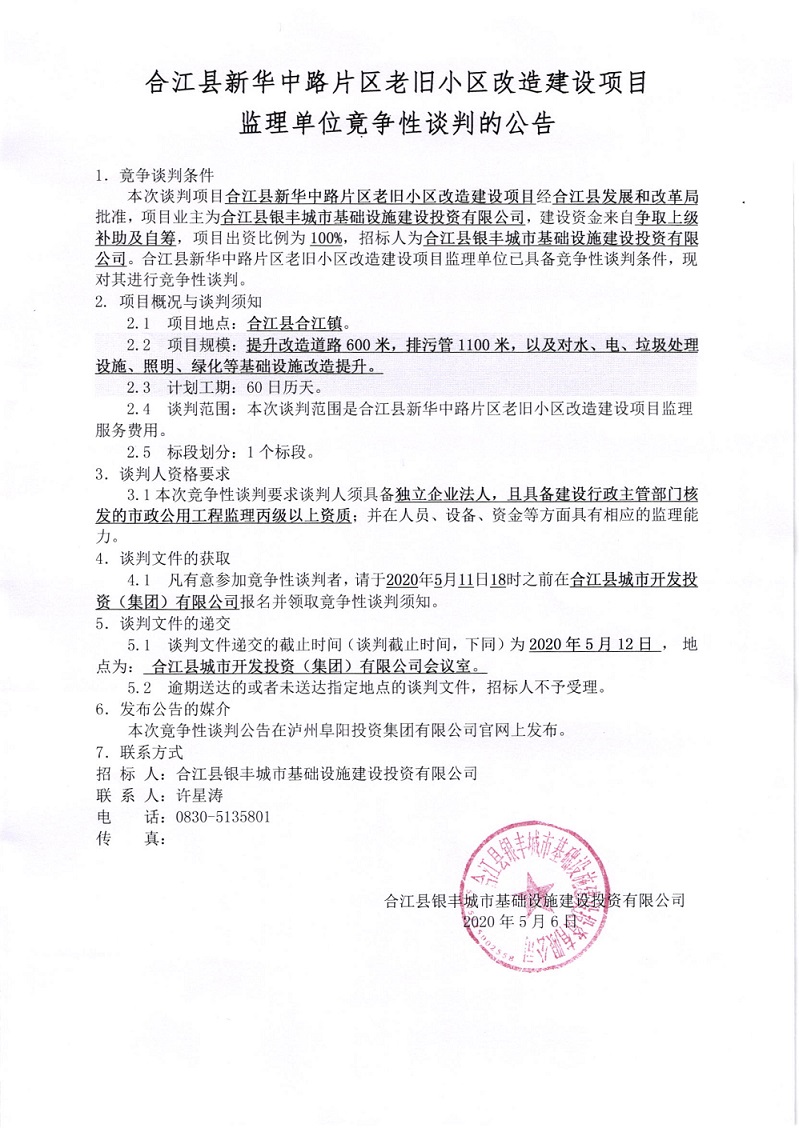 合江縣新華中路片區(qū)老舊小區(qū)改造建設(shè)項(xiàng)目監(jiān)理單位競(jìng)爭(zhēng)性談判的公告