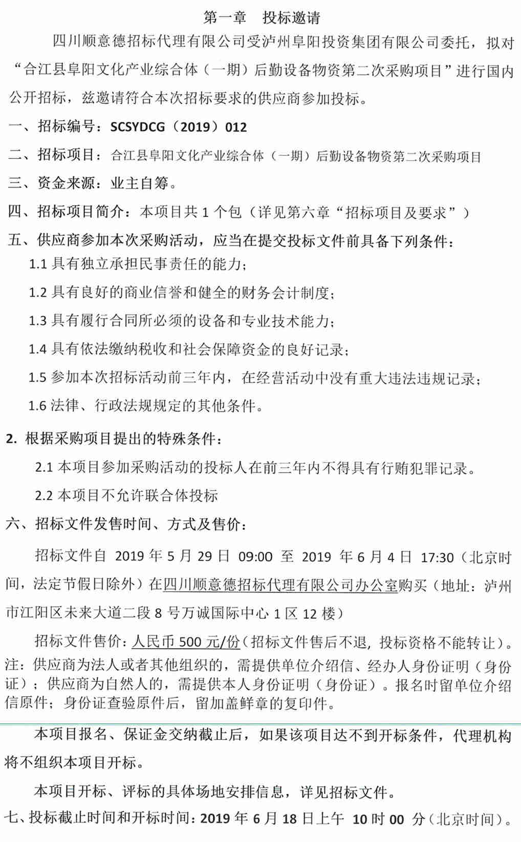 合江縣阜陽文化產業(yè)綜合體(一期)后勤設備物資第二次采購項目