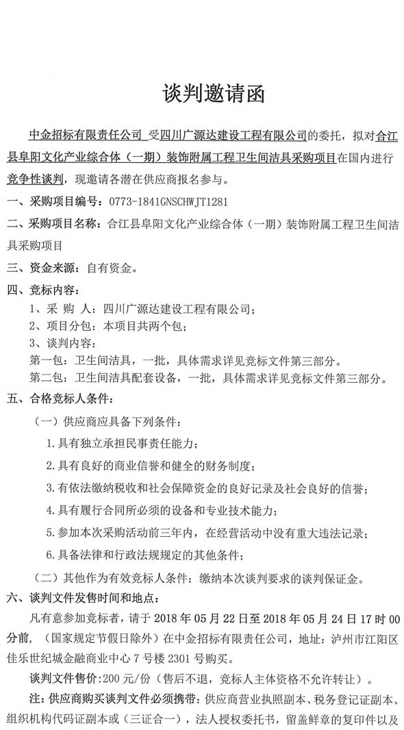 談判邀請函(合江縣阜陽文化產業(yè)綜合體(一期)裝飾附屬工程衛(wèi)生間潔具采購項目).doc