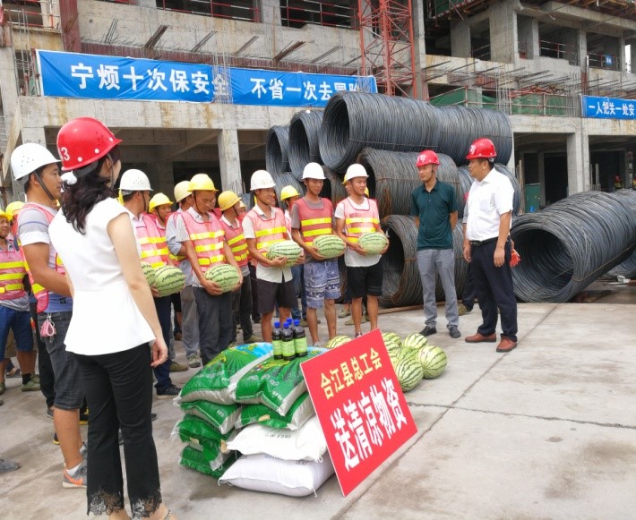 2019年8月5日下午,縣總工會會同城投公司、鑫晟公司、廣源達(dá)公司到鑫晟學(xué)府項目開展送“清涼”活動??h工會領(lǐng)導(dǎo)一行對建筑工人表示慰問,并為他們送上藿香正氣液、風(fēng)油精、西瓜、綠豆、白糖等降暑防暑物品。